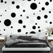 Questa carta da parati murale contemporanea presenta un design dinamico di cerchi neri e grigi su uno sfondo bianco brillante. Le variazioni di dimensione e colore dei cerchi creano un effetto visivo affascinante che conferisce un tocco moderno a qualsiasi ambiente.