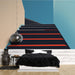 Questa carta da parati murale presenta un design grafico moderno che illustra una prospettiva stilizzata di una scala, dove i gradini neri sono valorizzati da tocchi di rosso e risaltano contro le pareti dai toni blu e beige. L'effetto visivo accattivante crea un'impressione di profondità, aggiungendo una dimensione intrigante alle tue pareti.