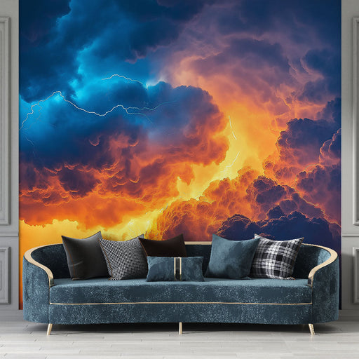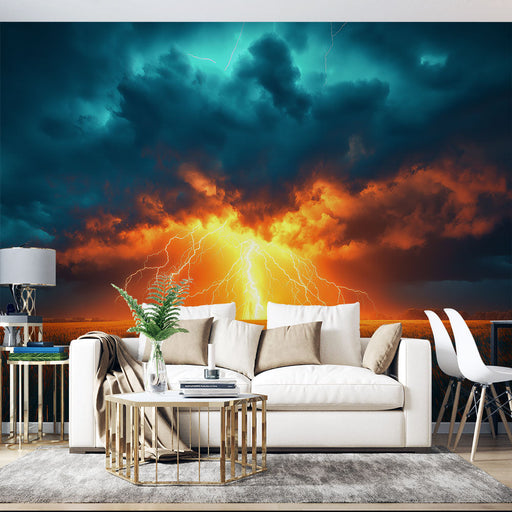 Per completare questa carta da parati, considera l'uso di colori scuri e neutri nei mobili e negli accessori, come nero, grigio o tonalità metalliche che accentueranno l'effetto luminoso dei fulmini. Alcuni tocchi di colore brillante potrebbero anche energizzare lo spazio.