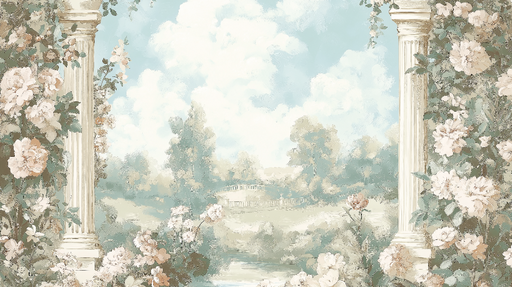 WonderMuralOnze shabby chic foto behang roept een serene landelijk landschap op, omlijst door klassieke zuilen en versierd met delicate bloemen in zachte tint...
