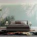 Dit foto behang roept een tropische sfeer op met zijn grote palmbladeren afgebeeld in tinten van groen en wit, die elegant opvallen tegen een rustgevende turquoise achtergrond. De patronen roepen weelderige natuur op, waardoor elke kamer kan worden omgevormd tot een ware oase van rust.