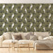 Onze prachtige exclusieve foto behang heeft een speels patroon van witte vogels die op palmboomstengels zitten, allemaal op een rustgevende olijfkleurige achtergrond. De combinatie van natuurlijke tinten en grafische patronen brengt een vleugje moderniteit met zich mee en roept een tropische sfeer op.