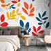 Deze foto behang heeft een levendig en speels patroon van kleurrijke bladeren in tinten van rood, oranje, geel en blauw, perfect om warmte en vitaliteit in uw interieur te brengen. De lichte achtergrond benadrukt de rijkdom van de kleuren, waardoor een vrolijke en gastvrije sfeer ontstaat.