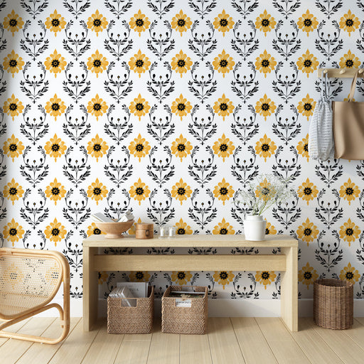 WonderMuralDeze behang heeft een levendig patroon van gele bloemen, delicaat gerangschikt tussen zwarte bladeren op een helder witte achtergrond. De harmonie ...