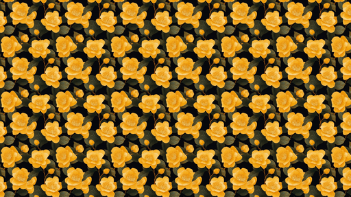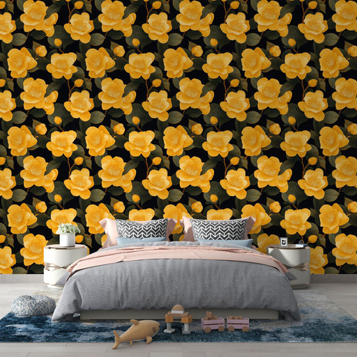 WonderMuralOnze behang heeft een levendig patroon van gele bloemen die delicaat gerangschikt zijn op een zwarte achtergrond, wat een opvallend contrast creëer...