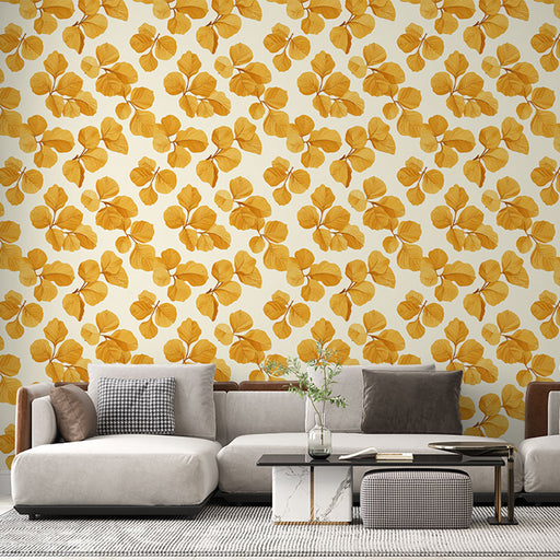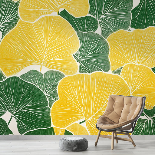 WonderMuralDeze behang benadrukt prachtige ginkgo blad patronen, in levendige tinten geel en groen. De dynamische schikking van de bladeren op een kleurrijke ...