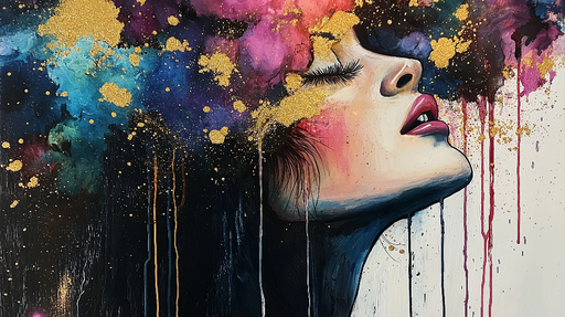 WonderMuralDeze fascinerende foto behang toont het gezicht van een vrouw dat opkomt uit een levendige wolk van kleuren en gouden uitbarstingen. Tinten blauw, ...