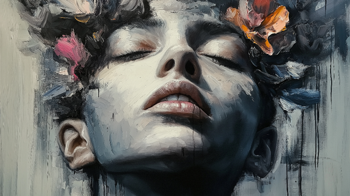 WonderMuralDeze abstracte foto behang benadrukt een mysterieus gezicht, gehuld in donkere tinten en boeiende texturen. De dynamische penseelstreken en gradiën...