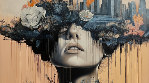 WonderMuralDeze betoverende foto behang toont een gestileerd gezicht omringd door vibrante bloemen, waardoor een dromerige en poëtische sfeer ontstaat. De rij...