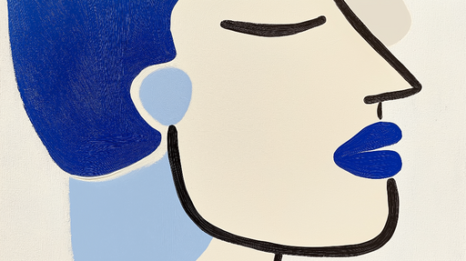 WonderMuralDeze foto behang heeft een abstract en minimalistisch ontwerp, met een gestileerd gezicht met opvallende kenmerken in blauw en beige. Diepzwarte li...