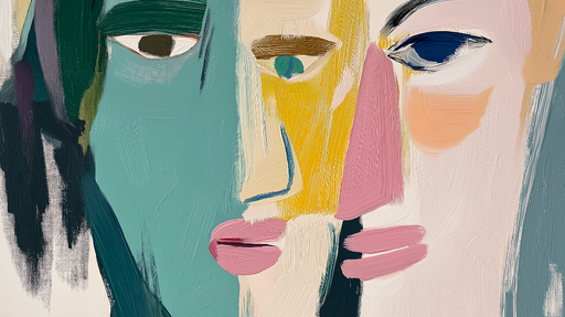 WonderMuralDeze betoverende foto behang toont gestileerde abstracte gezichten met een palet van zachte kleuren en harmonieuze tonen. Schakeringen van roze, gr...