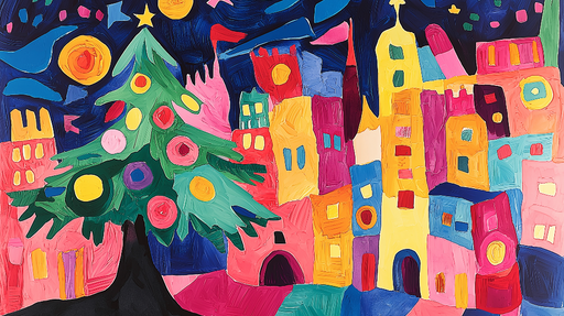 Deze foto behang toont een vrolijke Kersttafereel gevuld met levendige kleuren en speelse patronen. Op de voorgrond staat een Kerstboom versierd me...
