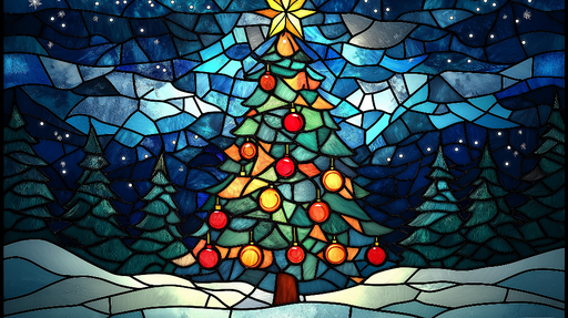 Deze prachtige foto behang toont een gestileerde Kerstboom, gecreëerd in een glas-in-lood stijl, met levendige kleuren van blauw, groen en goud. De...