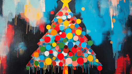 Dit spectaculaire foto behang toont een gestileerde Kerstboom, versierd met levendige verfbelletjes die een vrolijke en feestelijke sfeer creëren. ...