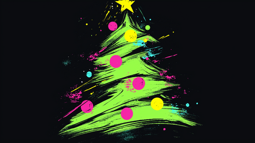 Deze fotobehang toont een gestileerde Kerstboom, geschilderd in felle kleuren zoals neon groen, roze en geel, op een zwarte achtergrond. Het artist...