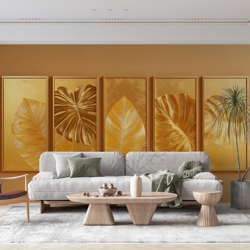WonderMuralOnze prachtige foto behang toont een set van gouden bladeren delicaat tentoongesteld in verfijnde frames, waardoor een luxe en moderne sfeer ontsta...