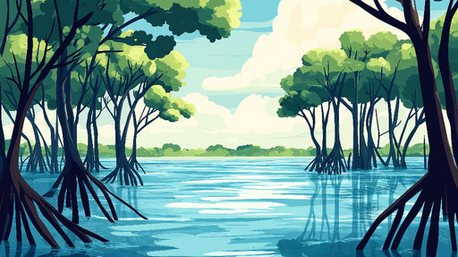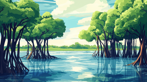 Dit foto behang illustreert een magnifieke scène van mangroven, waar de bomen met heldergroene bladeren een tropische en rustgevende sfeer creëren....