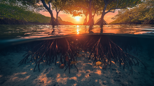 Dit foto behang toont een boeiend tafereel van mangroven gezien door het water, verlicht door de gouden tinten van een zonsondergang. De boomwortel...