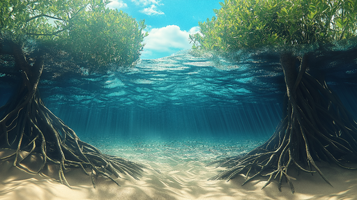 Dit boeiende foto behang toont een onderwaterzicht van de mangroven, waarbij hun slanke en robuuste wortels in een serene aquatische omgeving worde...