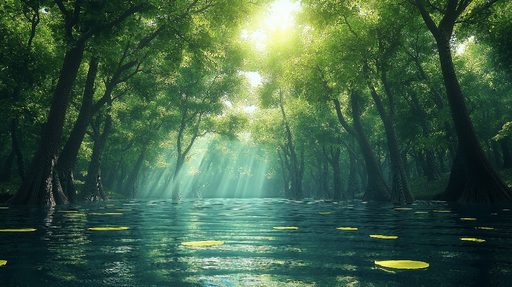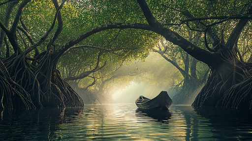 Ons foto behang kenmerkt zich door een magnifieke mangrove, waar zacht licht door het dichte gebladerte filtert. De heldergroene tinten van de bome...