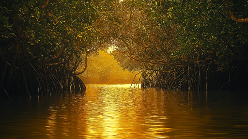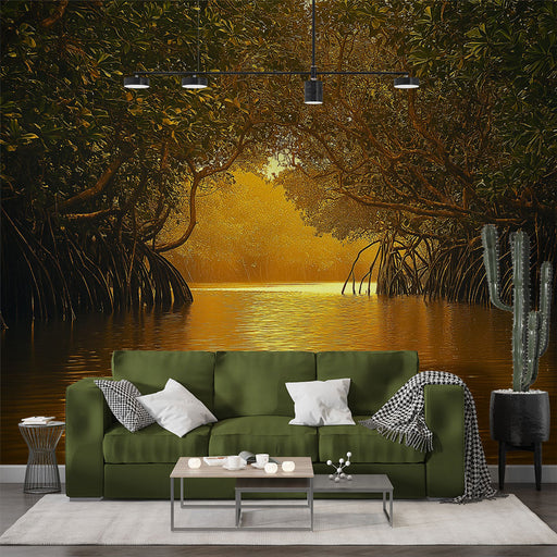 Dit foto behang roept een prachtige mangrovescène op, gehuld in gouden tinten bij zonsondergang, en creëert een rustgevende en poëtische sfeer. De ...