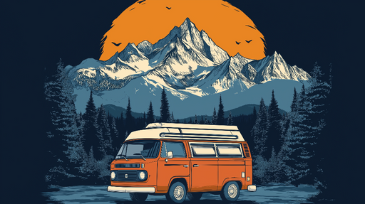 WonderMuralDit boeiende foto behang toont een oranje Volkswagen busje, een symbool van vrijheid en avontuur, geparkeerd voor majesteuze bergen onder een warme...