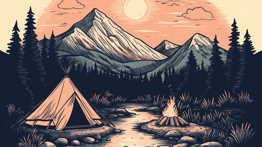 WonderMuralDit boeiende foto behang toont een traditionele camping scène, met een elegante tent en een warm, verlicht kampvuur. Het berglandschap op de achter...