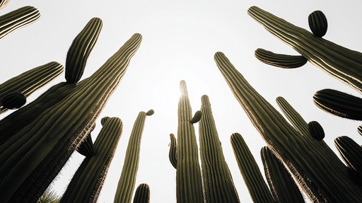 WonderMuralDit fotobehang illustreert een prachtig landschap van cactussen in een laag hoekshot, waarbij de schoonheid van de slanke vormen die naar de lucht ...