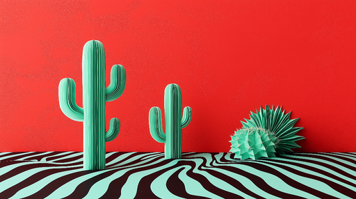 WonderMuralDeze fascinerende foto behang heeft een speels patroon van gestileerde cactussen in tinten turquoise die contrasteren met een helderrode achtergron...