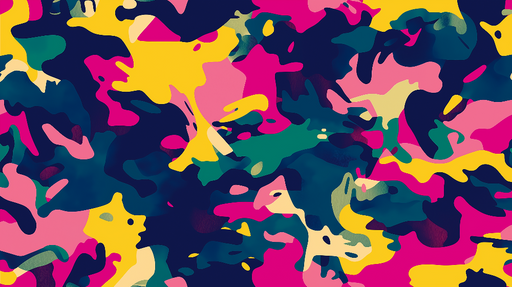 WonderMuralDeze foto behang heeft een abstract camouflagepatroon met levendige en onverwachte kleuren. De felle tinten fuchsia roze, levendig geel, smaragdgro...