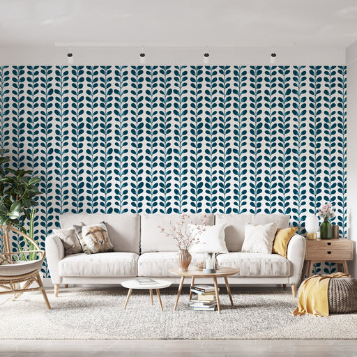 WonderMuralDeze fotobehang heeft een elegant patroon van turquoise bladeren die verticaal zijn uitgelijnd op een heldere witte achtergrond. Elk blad is zorgvu...