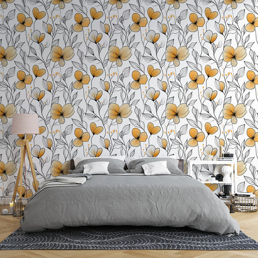 WonderMuralDeze behang heeft een mooi patroon van oranje bloemen subtiel getekend, verweven met dunne zwarte stelen op een crèmekleurige achtergrond. De bloem...