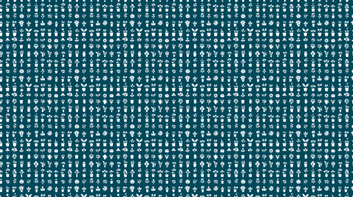 WonderMuralDeze behang toont een speels patroon van kleine illustraties van planten en bloemen in potten, repetitief gerangschikt op een diepblauwe achtergron...