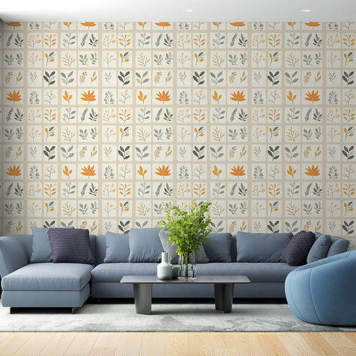 WonderMuralOntdek ons Foto Behang met bloemmotieven in vierkanten, een elegante compositie van bloemen en bladeren in warme en natuurlijke tinten. De tinten o...