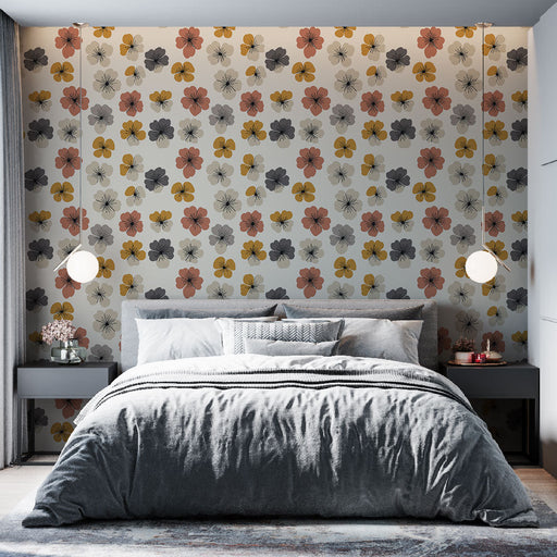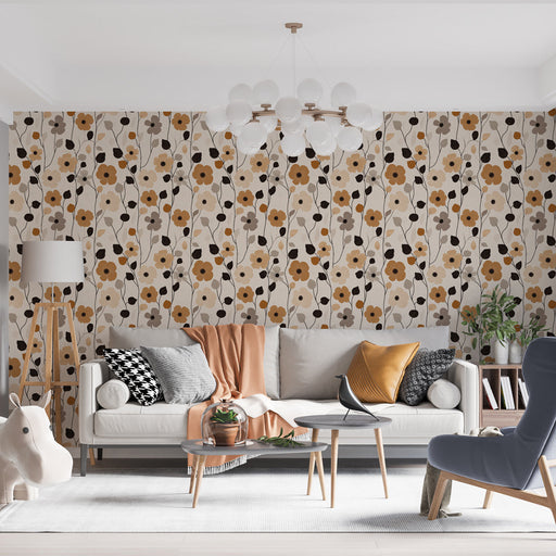 WonderMuralOnze foto behang heeft een prachtig patroon van warm getinte bloemen, variërend van helder oranje tot delicaat wit. Deze gestileerde bloemen, versi...