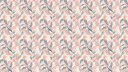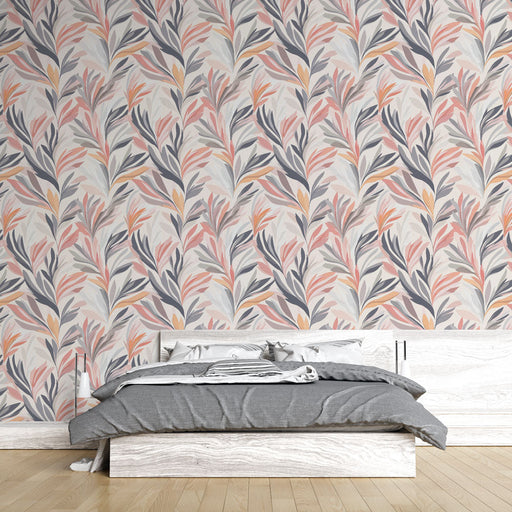 WonderMuralOnze fotobehang heeft een prachtig ontwerp van gestileerde bladeren in zachte tinten roze, oranje en grijs, op een lichte achtergrond die de hele k...
