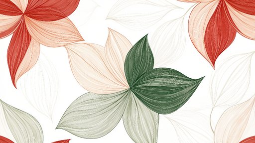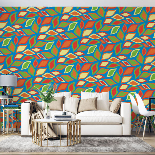 WonderMuralDeze foto behang heeft een mooi patroon van gestileerde bladeren in tinten variërend van rood, groen en crème, wat een boeiend en warm visueel effe...