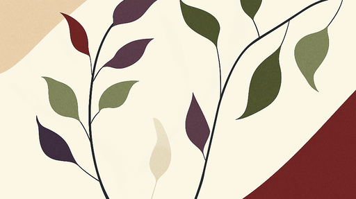 WonderMuralDeze foto behang heeft een elegant ontwerp van gestileerde bladeren in verschillende tinten, variërend van groen tot bordeaux, op een crèmekleurige...