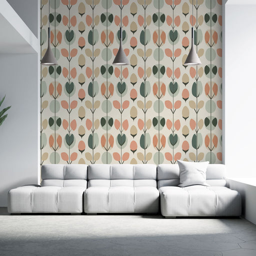 WonderMuralOntdek ons levendige bloemenbehang, met bloemen in zachte tinten van roze, geel en beige op een lichte achtergrond. De uitgelijnde stelen en blader...