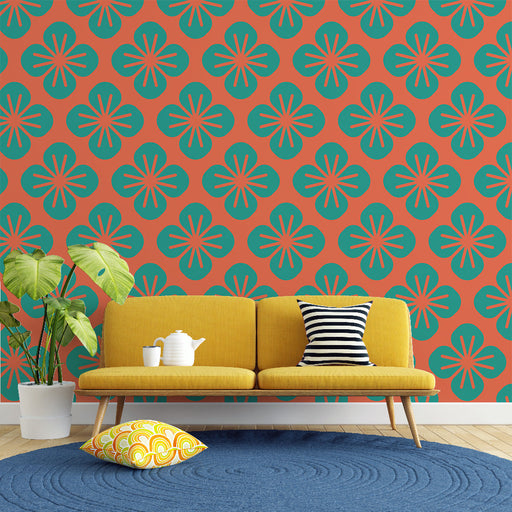 WonderMuralDeze behang springt eruit door zijn vintage bloemenpatroon, samengesteld uit grote bloemen in aardetinten en geometrische vormen in tinten oranje e...