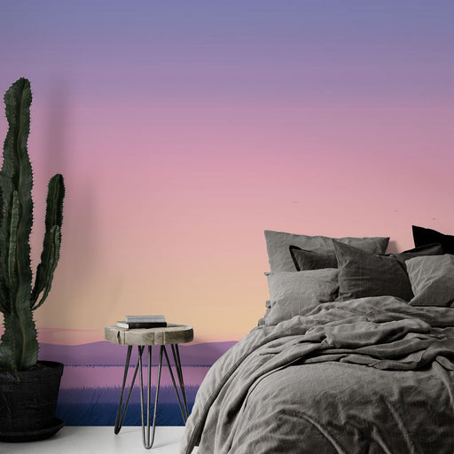 Dit prachtige foto behang toont een rustgevend prairielandschap, gehuld in zachte tinten van roze, blauw en lavendel, die de sereniteit van een zon...
