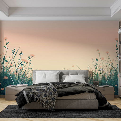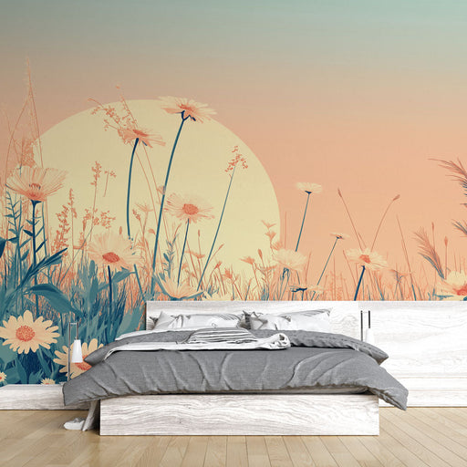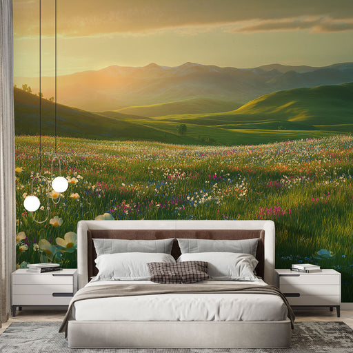 Dit foto behang roept een veld van wilde bloemen op, badend in het zachte licht van de zonsondergang. De uitgestrekte groene vlaktes zijn bezaaid m...