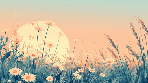 Dit foto behang toont een subliem landschap van weide, waar witte bloemen zachtjes zwaaien onder een pastelgekleurde zonsondergang lucht. De bergen...