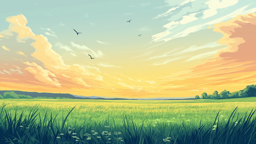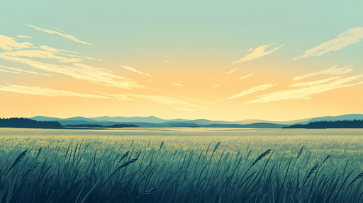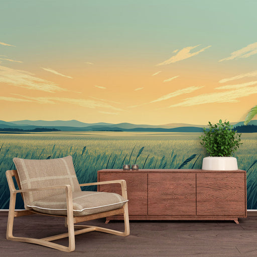 Dit prachtige foto behang toont een kalm en sereen prairielandschap, versierd met een rustgevend zonsonderganglicht dat zachte en warme tinten werp...