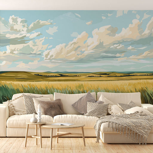 Dit foto behang roept een uitgestrekte prairie op, waar gouden velden samensmelten met groene graslanden onder een azuurblauwe hemel bezaaid met za...