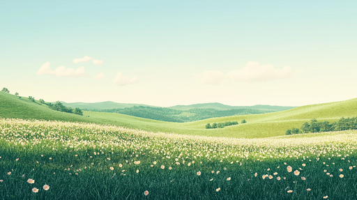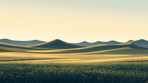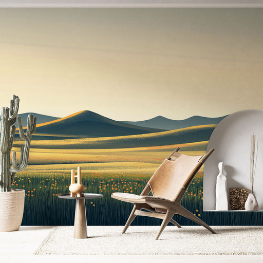 Dit foto behang roept een charmant prairie landschap op, versierd met delicate wilde bloemen en glooiende heuvels, wat een serene en authentieke sf...