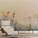 Dit foto behang roept een serene weide op, versierd met delicate bloemen in rustgevende pastel tinten zoals geel, oranje en wit. De bloemige compositie benadrukt lichtheid en zachtheid, terwijl de subtiele achtergrond een kalme en rustige sfeer oproept.