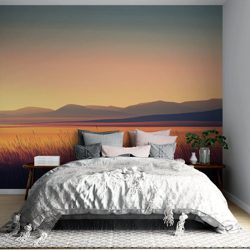 WonderMuralDit boeiende foto behang toont een prachtig prairielandschap dat baadt in de gloed van een zonsondergang. De zachte kleurverlopen in tinten van bla...
