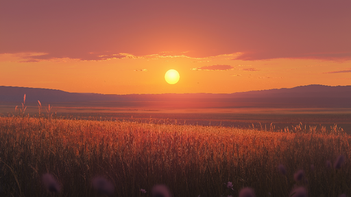 WonderMuralDit magnifieke foto behang illustreert een prairielandschap dat wordt gebaad door een zachte zonsondergang, waar de warme tinten van oranje en roze...