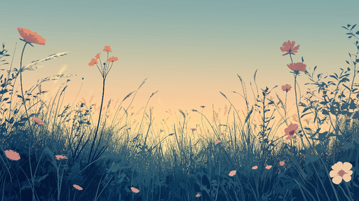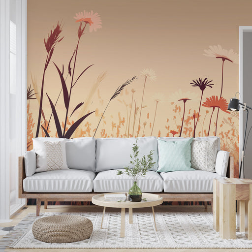 WonderMuralDit foto behang illustreert een wilde weide die baadt in het zachte licht van de schemering, met silhouetten van bloemen en grassen die zachtjes da...